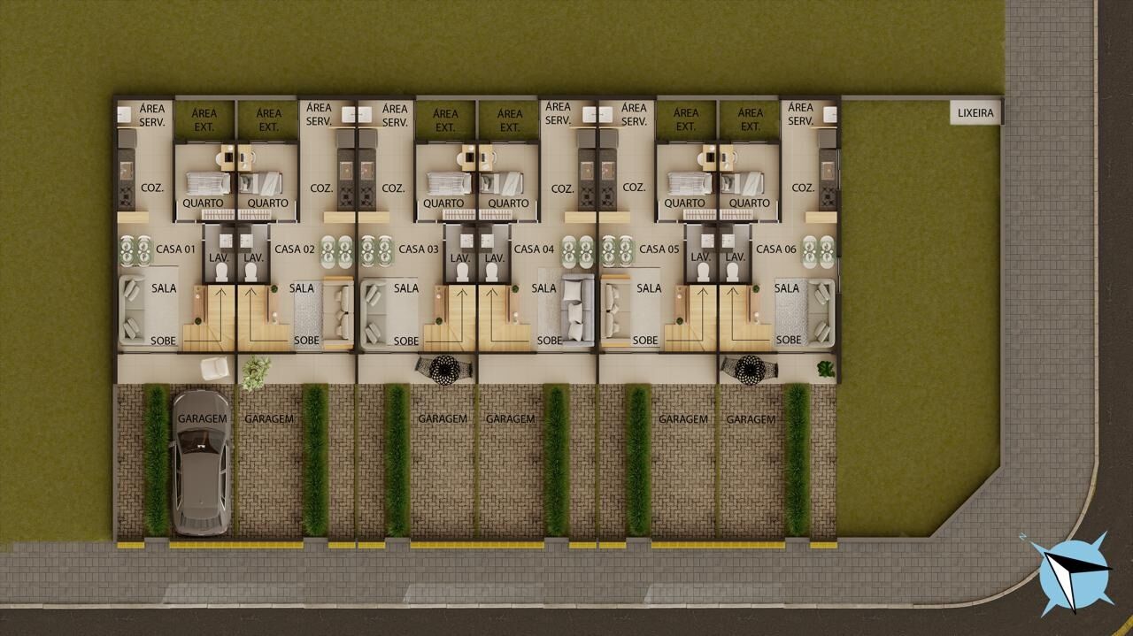 6 casas duplex com aproximadamente 71 m² de área útil.